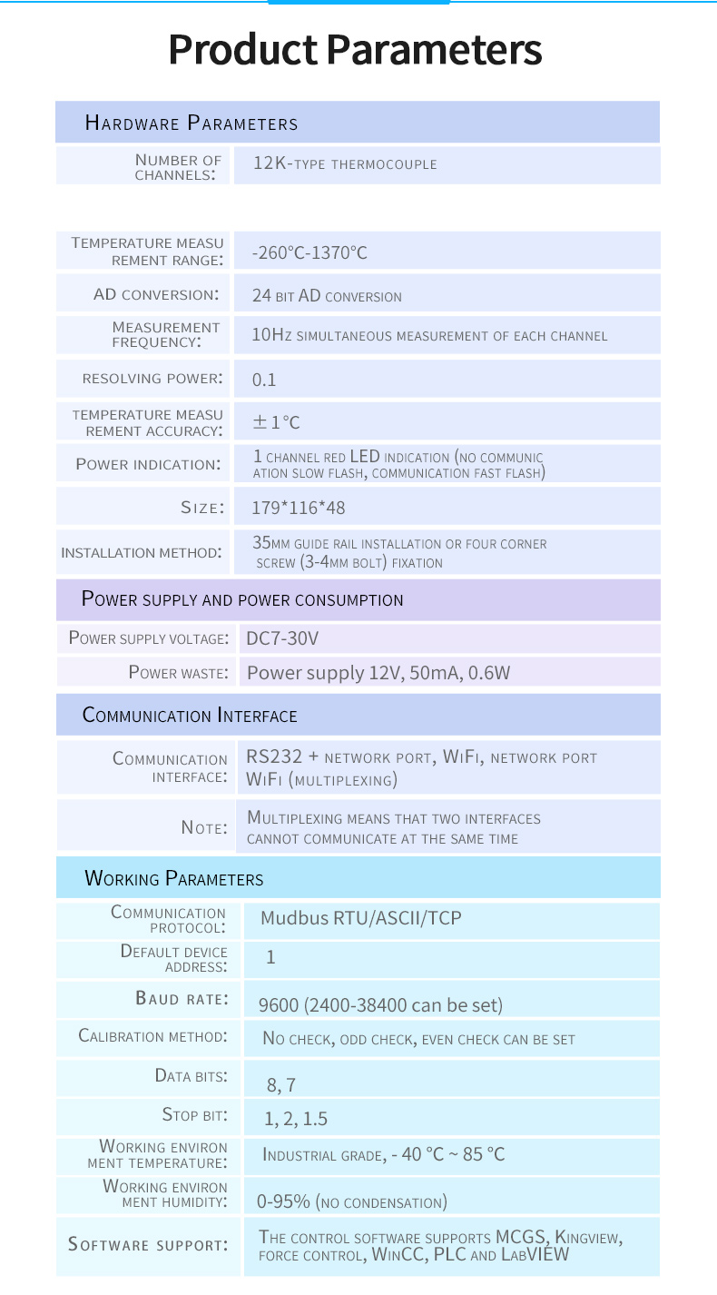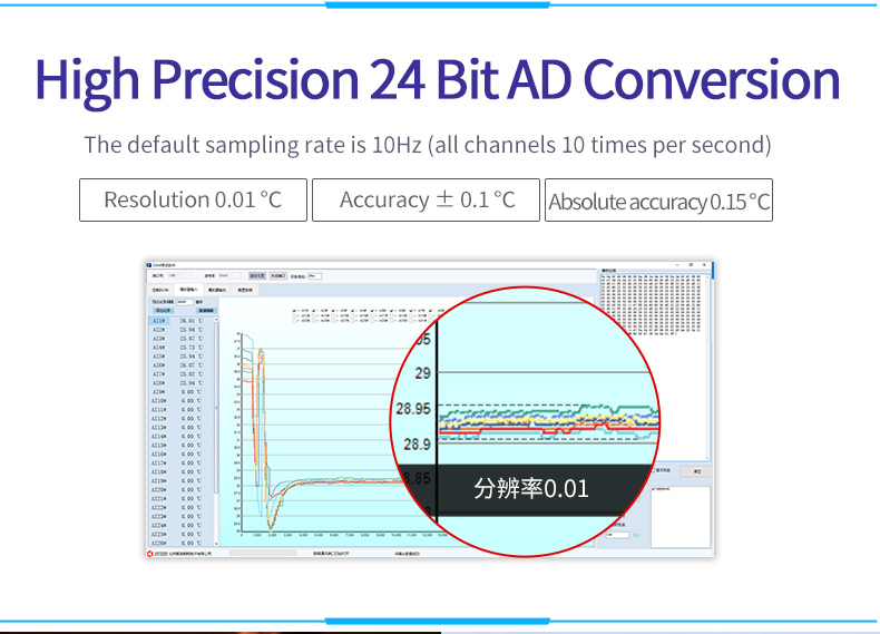 High precision 24 bit AD conversion resolution 0.01The temperature measure ment accuracy is 0.1℃Acquisition frequency 10HzSupport multi-channel simultaneous acquisitionThe device is compatible with twowire and three wire PT100 sensors